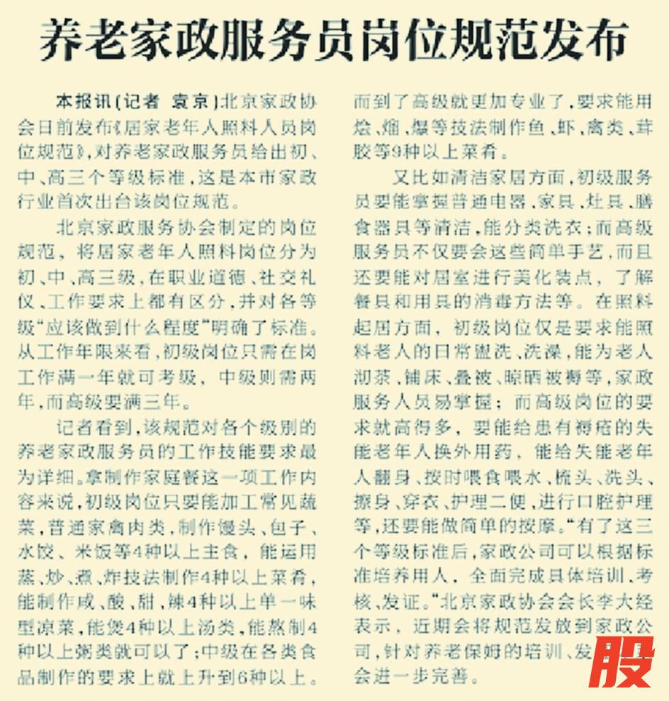 2014年,北京家政协会发布《居家老年人照料人员岗位规范》,对养老家政服务员给出初、中、高三个等级标准,这是本市家政行业首次出台该岗位规范。拿清洁家居来说,初级服务员要能掌握普通电器、家具、灶具、膳食器具等清洁方法,能分类洗衣;而高级服务员不仅要会这些简单手艺,而且还要能对居室进行美化装点,了解餐具和用具的消毒方法等。(2014年1月3日《北京日报》5版,《养老家政服务员岗位规范发布》)
