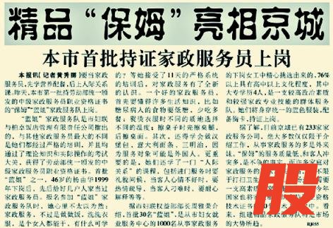 那时候,本市劳动部门发出通知,对家政服务人员进行职业技能培训和就业资格认定作出规定。1995年,北下关街道三八服务公司对来自四川、河南、安徽等地的保姆进行了专业培训,内容涉及法律知识、卫生与安全常识、家庭操作技能、社交礼仪、品德教育、儿童心理学等多个方面。结果,33人通过结业考试,成为本市首批持证上岗的保姆。(1995年11月29日《北京日报》1版,《小保姆“持证上岗”》)