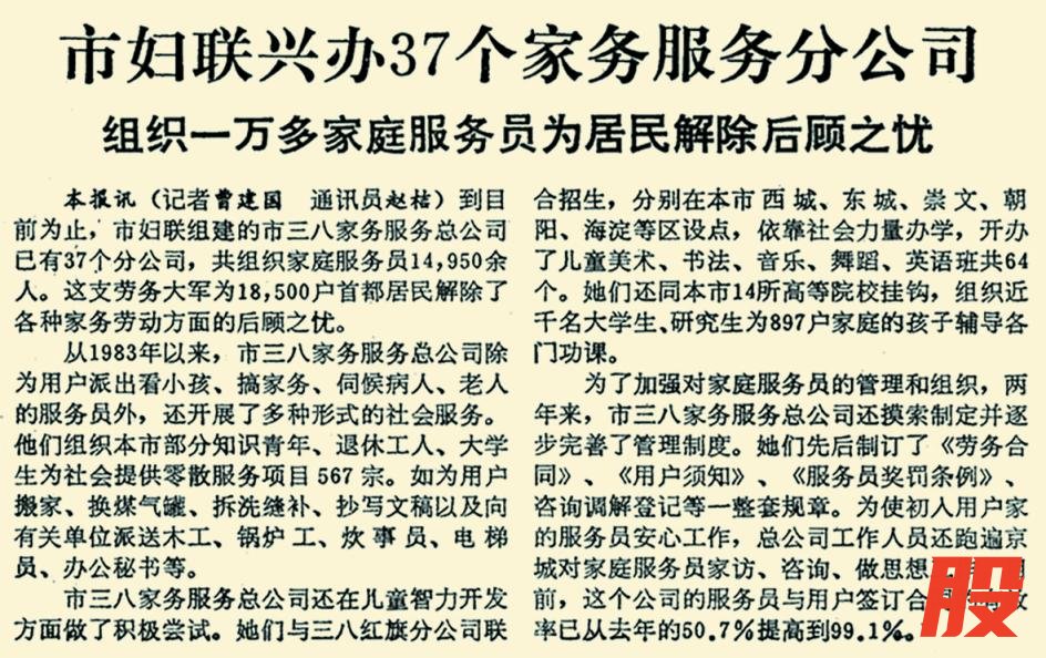 为了满足更多家庭的服务需求,1984年,市妇联主办的北京市三八家务服务总公司成立。该公司除为用户派出看小孩、搞家务、伺候病人、老人的服务员外,还开展了多种形式的社会服务,如为用户搬家、换煤气罐、拆洗缝补等。一年多时间,该公司成立了37个分公司,分布在全市各区县,家庭服务员与用户签订合同的有效率达到99.1%。(1985年12月22日《北京日报》1版,《市妇联兴办37个家务服务分公司》)