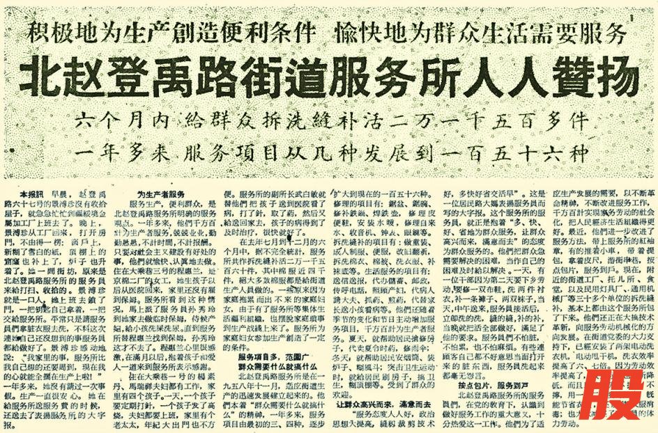 后来,北京的街道开始成立服务所,配有服务员,如果谁家有雇保姆的需求,也能帮着解决。住在大乘巷三号的程女士是京棉二厂的女工,她在医院生完孩子回家,没雇到保姆。服务所了解这个情况后,马上派服务员到她家去做临时保姆,侍候产妇和孩子,一家人特别感激。(1960年3月6日《北京日报》1版,《北赵登禹路街道服务所人人赞扬》)