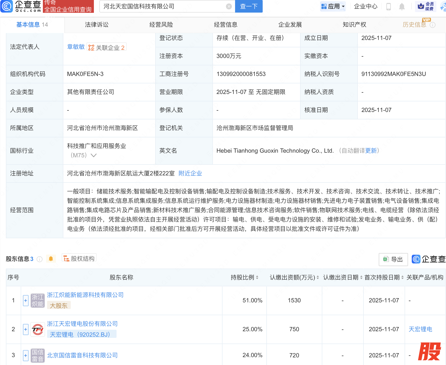近日,河北天宏国信科技有限公司成立,注册资本3000万元,经营范围包含:集成电路销售;集成电路芯片及产品销售;新材料技术推广服务;合同能源管理等。企查查股权穿透显示,该公司由天宏锂电(920252)等共同持股。