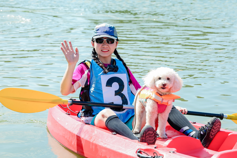而最受瞩目的当数特色携宠水上赛事,携宠组比赛成为全场焦点。大型犬组与小型犬组分区竞技,金毛、边牧、柯基等萌犬“船员”姿态各异,有的端坐艇头威风凛凛,有的兴奋扑水憨态可掬。在女子携大型犬组比赛中,一只拉布拉多因见到湖水过于兴奋,中途跃入湖中“抢镜”。主人李女士临危不乱,一边奋力划艇,一边抛出玩具引导爱犬回艇,最终顺利完成比赛。“虽然没拿名次,但能和狗狗一起挑战自我,就是最棒的回忆!” 李女士笑着分享道。