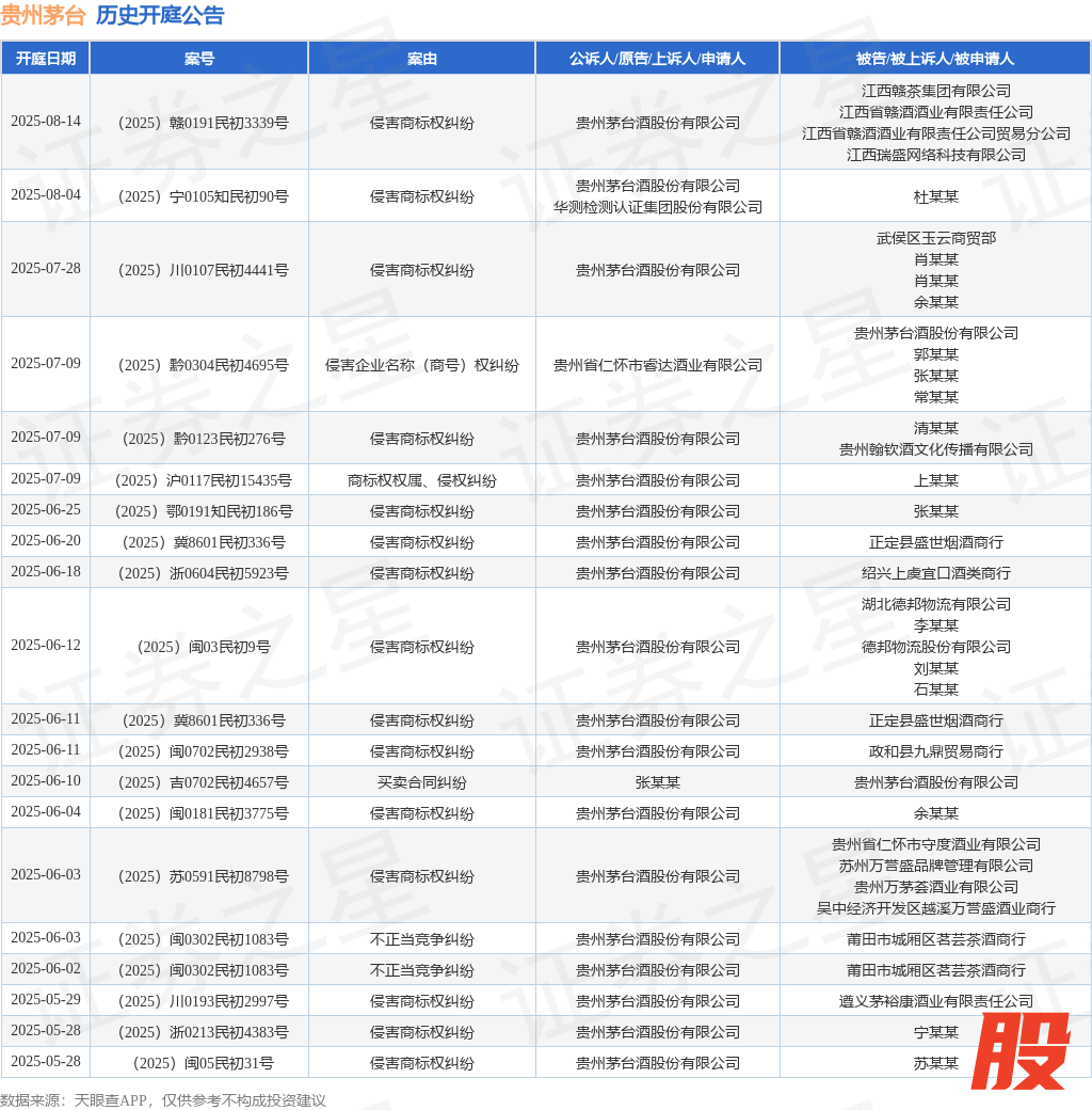 案号:(2025)冀8601民初336号审理法院:石家庄铁路运输法院案由:侵害商标权纠纷当事人信息: 原告/上诉人:贵州茅台酒股份有限公司 被告/被上诉人:正定县盛世烟酒商行开庭日期:2025年6月20日根据统计,近一年内以贵州茅台酒股份有限公司为当事人的历史开庭公告有286则,其中案由为“侵害商标权纠纷”的公告以222则居首,其次为“商标权权属、侵权纠纷”有20则,“假冒注册商标罪”有9则。历史开庭公告(前20条)如下: