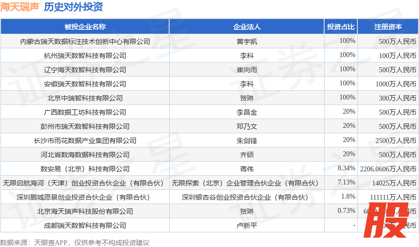 本站消息,根据天眼查APP显示,海天瑞声(688787.SH)新增一起对外投资事件,被投资公司为广西数据工坊科技有限公司,法定代表人李昌金,投资占比为20%。该公司从事软件和信息技术服务业,注册资本为500万人民币。目前,海天瑞声共存在对外投资14项,详见下表: